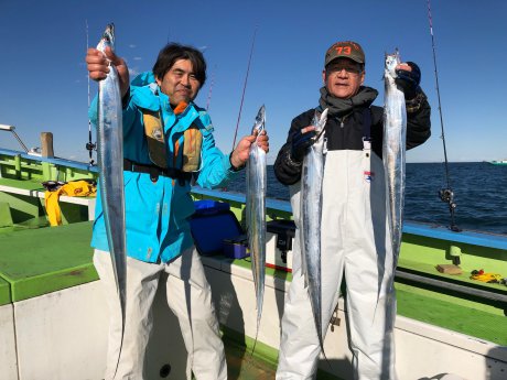 「タチウオ船担当船長コメント」 横浜沖の40m前後を狙いました。 前半は反応少なく苦戦しましたが、中盤~後半は群れが固まり、タチウオの活性も良く好調に釣れました。 サイズは文句なしの良型サイズが主体で、トップ27匹で、半数以上の方が15匹前後ゲットできました。 連日空いています。皆様のご予約お待ちしています。 状況次第で深場ポイントも攻めますので、リ-ル(PEライン)の予備がある方はお持ちください。 竿は胴のしっかりした先調子の竿がおすすめです。 その日のシャクリパターンをいかに掴むかが釣果UPの鍵です。色々、変化をつけて試してみてください。 タナ取りは海面から、指示ダナ厳守でお願いしています。 リ-ルの水深計は必ず誤差がでますので、PEラインのマ-クで正確な計測をお願いします。 PEラインは2号厳守、オモリ40・60・80・100号を使用します。(皆様統一します) 天秤、オモリの予備は必需品です。 ※当船はエサ釣り専門ですので、ルア-釣りは禁止です。 オマツリはお互い様です。全員で協力して楽しく釣りましょう!
