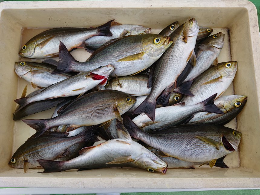 | 「ライト五目船担当船長コメント」 久里浜沖~下浦沖~剣崎沖の30~100mをライトタックルで狙います。 ヒット率&お土産重視で、イナダ、ワラサ、アマダイ、イシダイ、イサキが釣れて楽しめました。 ジャンボアマダイは、55cm、54cm、42cmが2匹、41cmの計5匹ゲットできました。 明日も凪予報です。皆様のご予約お待ちしています。 タックルは、アマダイ、タチウオ用の誘い重視のタックルがおすすめです。 オマツリはお互い様です。全員で協力して楽しく釣りましょう! |