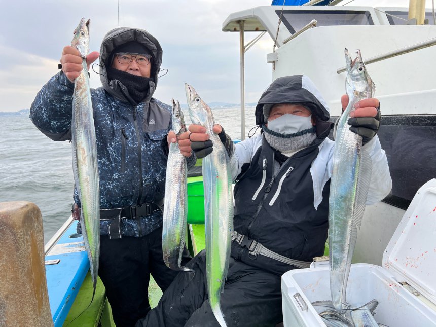 | 「タチウオ船担当船長コメント」 大津沖~走水沖~観音崎沖の60m前後を狙いました。 北風強風で釣りづらい状況でしたが、タチウオの活性は良く終始順調に釣れました。 良型率も良く、トップ17匹が2名で、8割の方が10匹超えでした。 皆様のご予約お待ちしています。 天秤釣り&テンヤ釣りの合同船になります。 サバの切り身は船に常備していますが、イワシ(別料金)が必要な方は必ず出船前に購入してください。 ※ルアー釣りは禁止です。 オマツリはお互い様です。全員で協力して楽しく釣りましょう! 誘い重視のシャクリ釣りになりますので、テクニック・根気・体力勝負です。 ヒットパターン攻略目指してがんばりましょう。 状況により、浅場ポイント~深場ポイントまで幅広く狙います。 タナ取りは海面から、指示ダナ厳守でお願いしています。 リ-ルの水深計は必ず誤差がでますので、PEラインのマ-クで正確な計測をお願いします。 乗船開始集合時間 6:00 釣り座は乗船先着順です。 タチウオ船 7:10離岸 7:15出船~14:00終了 |