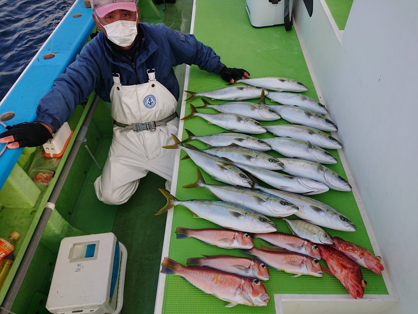 | 「ライト五目船担当船長コメント」 久里浜沖~下浦沖~剣崎沖の40~100mを狙います。 ヒット率&お土産重視で、イナダ、アマダイ、カイワリ、カンコが釣れて楽しめました。 タックルは、アマダイ、タチウオ用のタックルでOKです。 皆様のご予約お待ちしています。 オマツリはお互い様です。全員で協力して楽しく釣りましょう! |