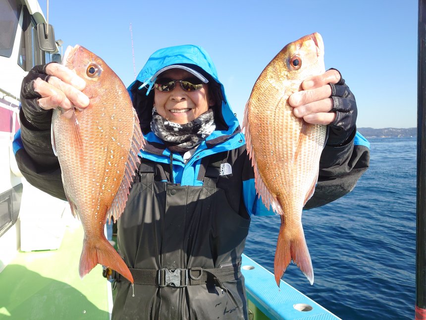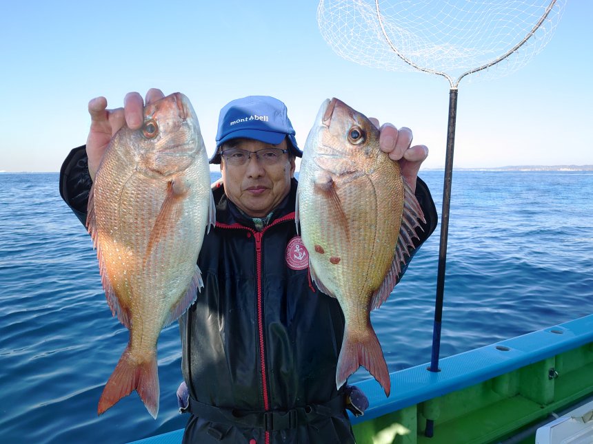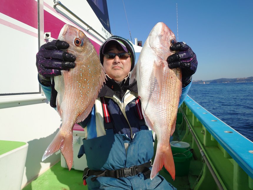 | 「マダイ船担当船長コメント」 久里浜沖の40m前後を狙い、ヒットが多発して爆釣でした。 トップ16匹、続いて14匹、10匹で、船中46匹と大漁釣果になりました。 マダイの他、イシダイ、クロダイ、イナダも登場しました。 冬マダイは脂ノリノリで食味も抜群ですね。 明日も晴天凪予報、ご予約受付中です。 マダイは警戒心が強く、ビシひとつの落下で群れが散ってしまいます。 タナ取りは海面から、指示ダナ厳守でお願いしています。 リ-ルの水深計は必ず誤差がでますので、PEラインのマ-クで正確な計測をお願いします。 オマツリはお互い様です。全員で協力して楽しく釣りましょう! 乗船開始集合時間 5:30 釣り座は乗船先着順です。 6:50離岸 7:00出船~14:00終了 |