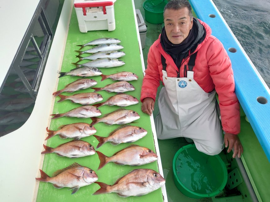 | 「マダイ船担当船長コメント」 久里浜沖の40m前後を狙い、マダイ、クロダイ、イナダが登場してヒット多く爆釣でした。 5名で、マダイトップ13匹、続いて12匹が2名、3匹が2名で大漁釣果になりました。 仕掛けは細工なしのシンプルな物がお勧め、長さは10m統一です。 明日は晴天凪予報、ご予約受付中です。 マダイは警戒心が強く、ビシひとつの落下で群れが散ってしまいます。 タナ取りは海面から、指示ダナ厳守でお願いしています。 リ-ルの水深計は必ず誤差がでますので、PEラインのマ-クで正確な計測をお願いします。 オマツリはお互い様です。全員で協力して楽しく釣りましょう! 乗船開始集合時間 5:30 釣り座は乗船先着順です。 6:50離岸 7:00出船~14:00終了 |